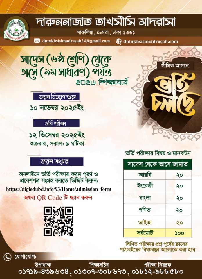 | January 1, 1970 | দারুননাজাত তাখসীসি মাদরাসার ২০২৬ শিক্ষাবর্ষের ভর্তি পরীক্ষা আগামী ১২ ডিসেম্বর-২৫ রোজ শুক্রবার সকাল ৯টায় অনুষ্ঠিত হবে। প্রয়োজনে যোগাযোগ: 01719439634, 01812988580 | |